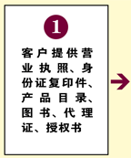 ①客戶提供營業(yè)執(zhí)照、身份證復(fù)印件、產(chǎn)品目錄、圖書、代理證、授權(quán)書。